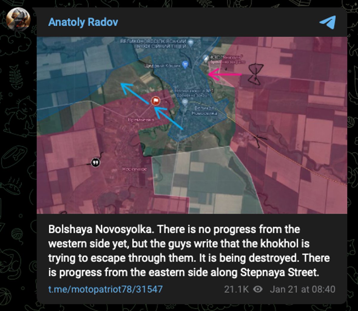 By mid-January, adverse weather conditions compelled Russian forces to rely solely on infantry assaults, as the environment was not conducive for drones or armored vehicles. On January 15, Russian troops entered Vremivka, and by around January 18, they had fully seized control of the town. As of January 22, Ukrainian forces in Velyka Novosilka are effectively encircled, with local commanders seeking permission to withdraw from the area.