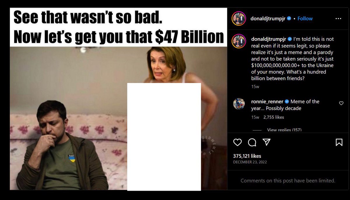 Er hat einige unlustige Memes zum Thema Selenskyj gepostet & sogar Witze über den brutalen Angriff auf Paul Pelosi, den Mann der damaligen Sprecherin des 🇺🇸 Repräsentantenhauses, Nancy Pelosi, gemacht.