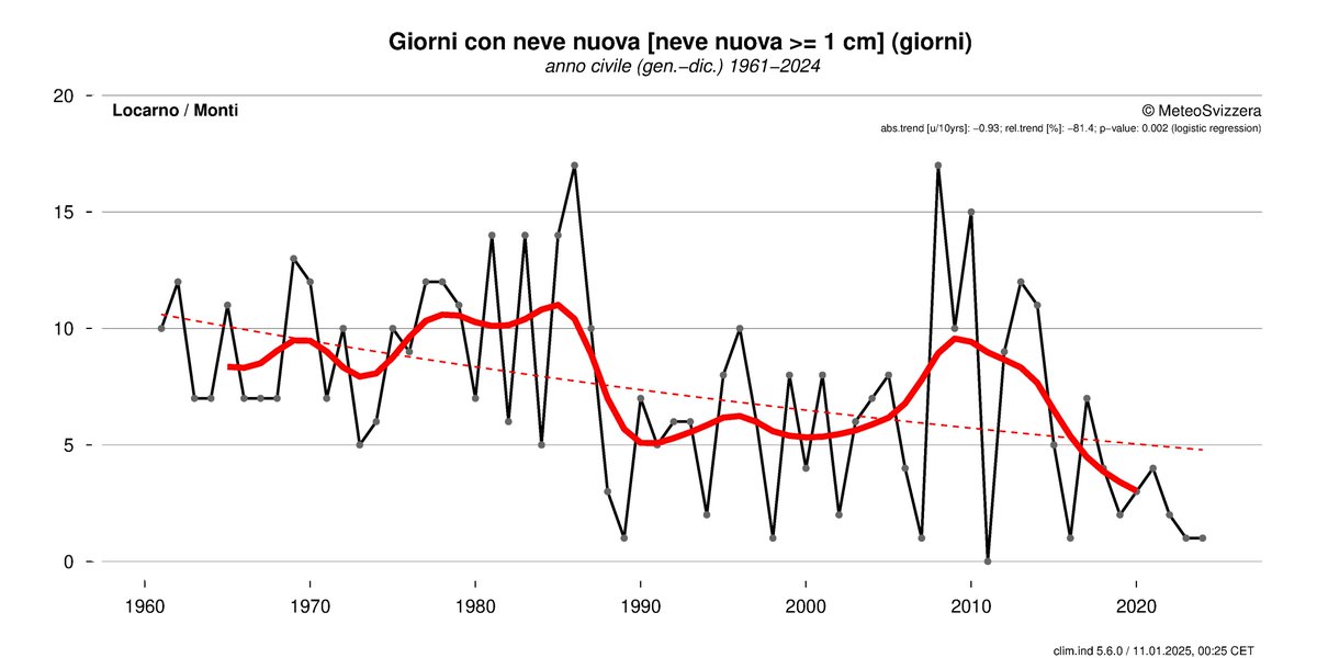 Dando uno sguardo all’evoluzione della somma annuale del numero di giorni in cui si misura neve fresca, si nota negli ultimi decenni una diminuzione significativa a tutte le quote, quindi anche in pianura. Ciò è dovuto all’aumento delle T / (9/10)