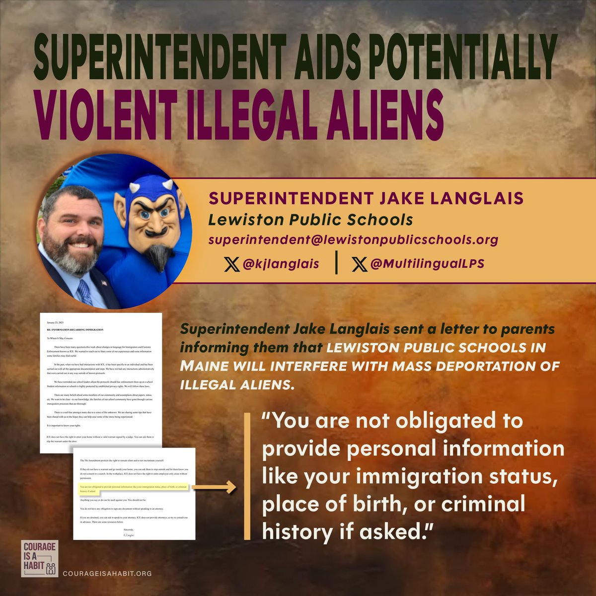 Meet Jake Langlais (@kjlanglais), Superintendent of Lewiston Public Schools (@MultilingualLPS). He sent a notice today informing parents he will obstruct the deportation of illegal aliens, even ones with criminal records.