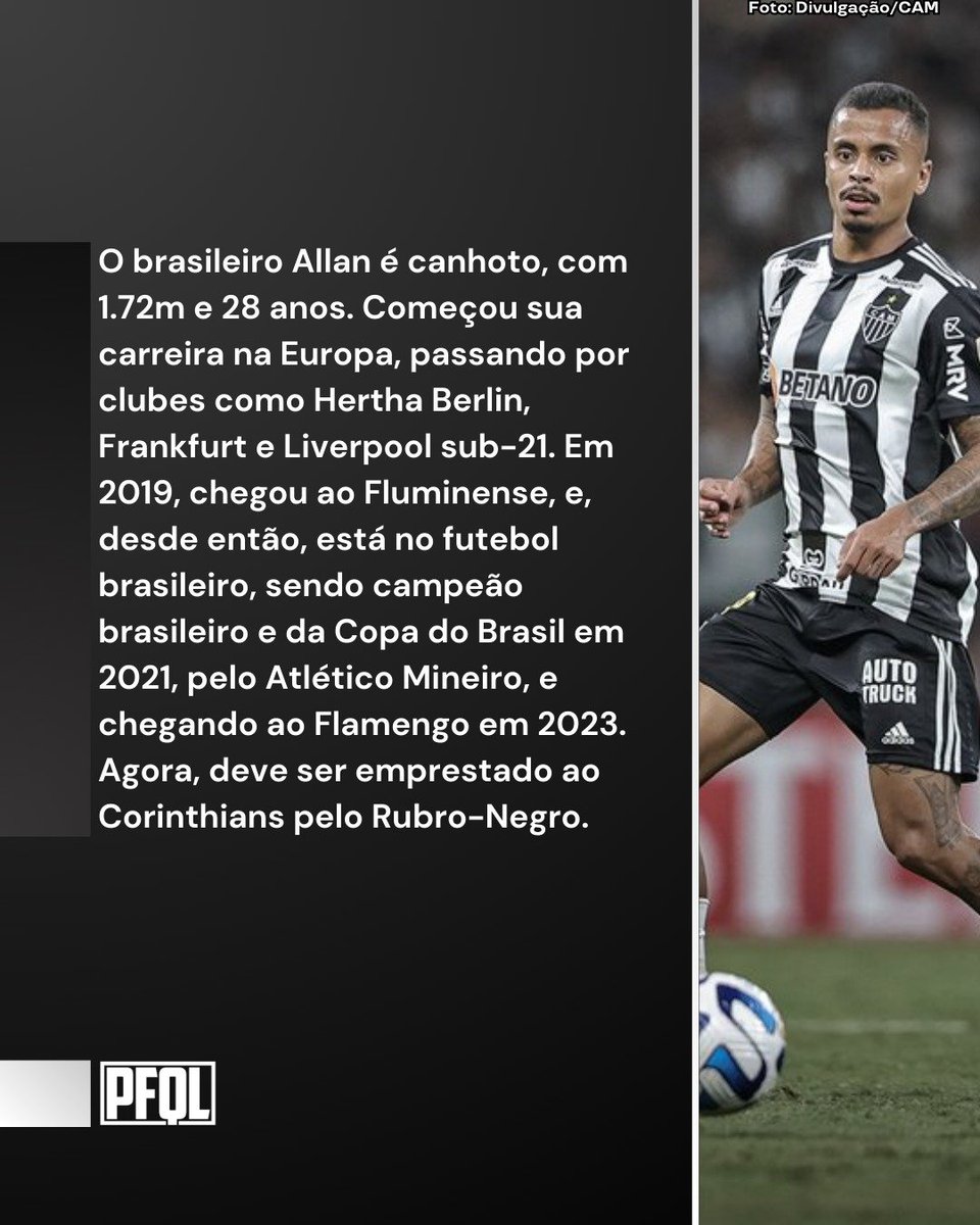 O brasileiro Allan é canhoto, com 1.72m e 28 anos. Começou sua carreira na Europa, passando por clubes como Hertha Berlin, Frankfurt e Liverpool sub-21. Em 2019, chegou ao Fluminense, e, desde então, está no futebol brasileiro, sendo campeão brasileiro e da Copa do Brasil em 2021, pelo Atlético Mineiro, e chegando ao Flamengo em 2023. Agora, deve ser emprestado ao Corinthians pelo Rubro-Negro.