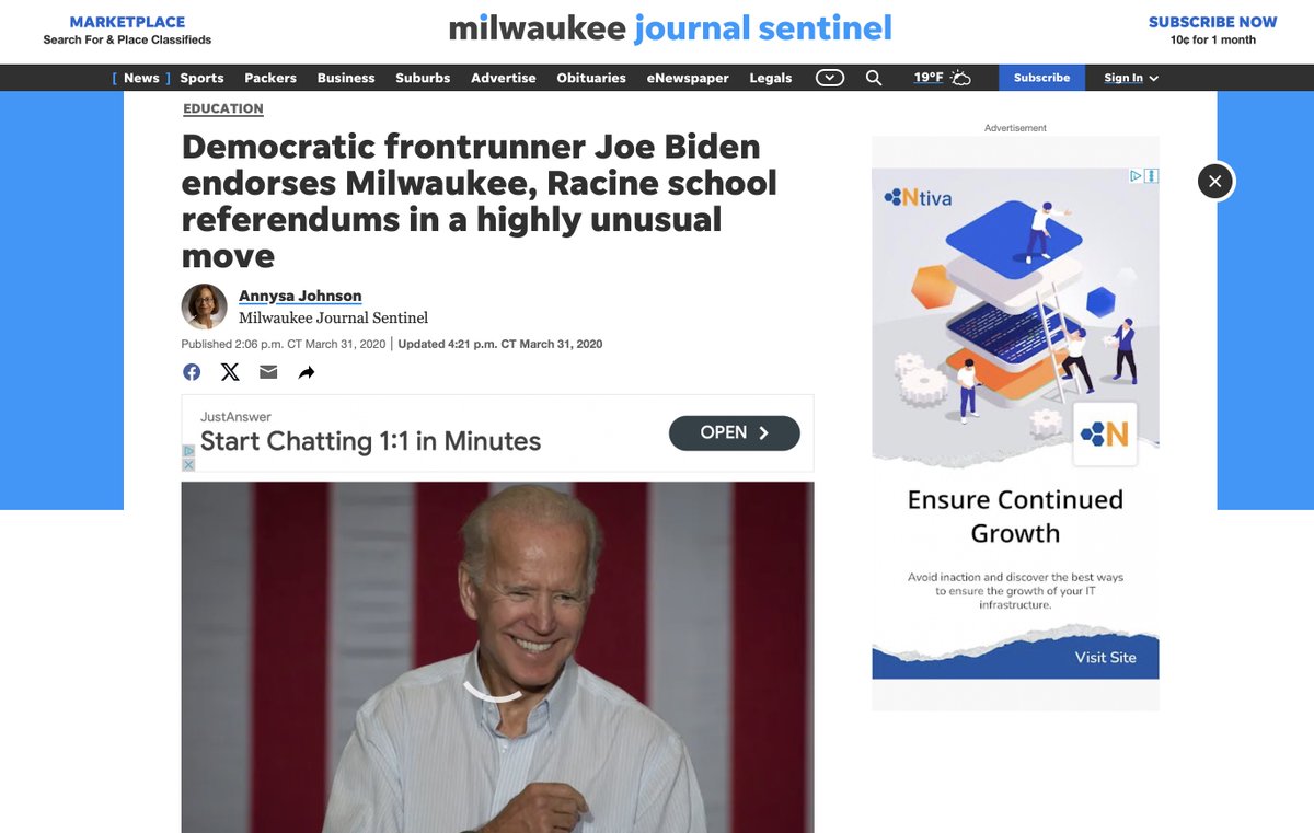 Is it also a conspiracy theory that Joe Biden made a “highly unusual move,” followed by Bernie Sanders, to personally intervene and endorse a billion dollar referendum in the April 2020 primary election in Racine, Wisconsin? 3/