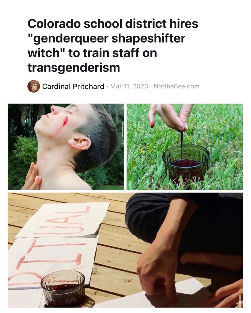 4/ Here I discovered that someone else was invited in to groom and sexualize my daughter …. A self-proclaimed “genderqueer shapeshifting blood witch” who plays in her own blood, mutilates her own body, and publicly writes about her experiences in Aleister Crowley sex dungeons.