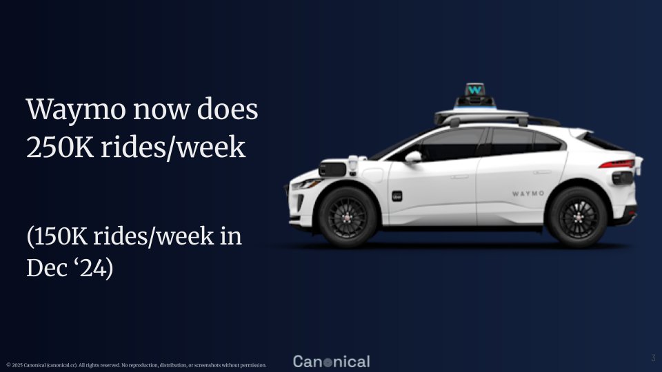 Consider autonomous driving. Waymo now completes 250K autonomous rides/week, up from 150,000 per week at the end of 2024.