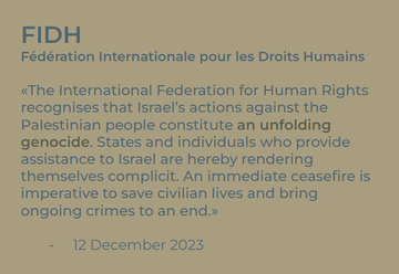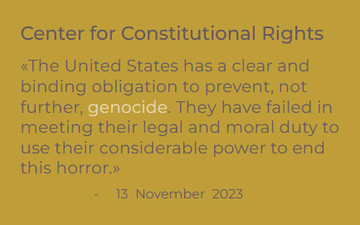 In mid-November 2023, FIDH member organisations such as Al-Haq (@alhaq_org), and the Center for Constitutional Rights filed a lawsuit against the President of the United States and other senior U.S. officials for their failure to prevent genocide and their complicity in it.