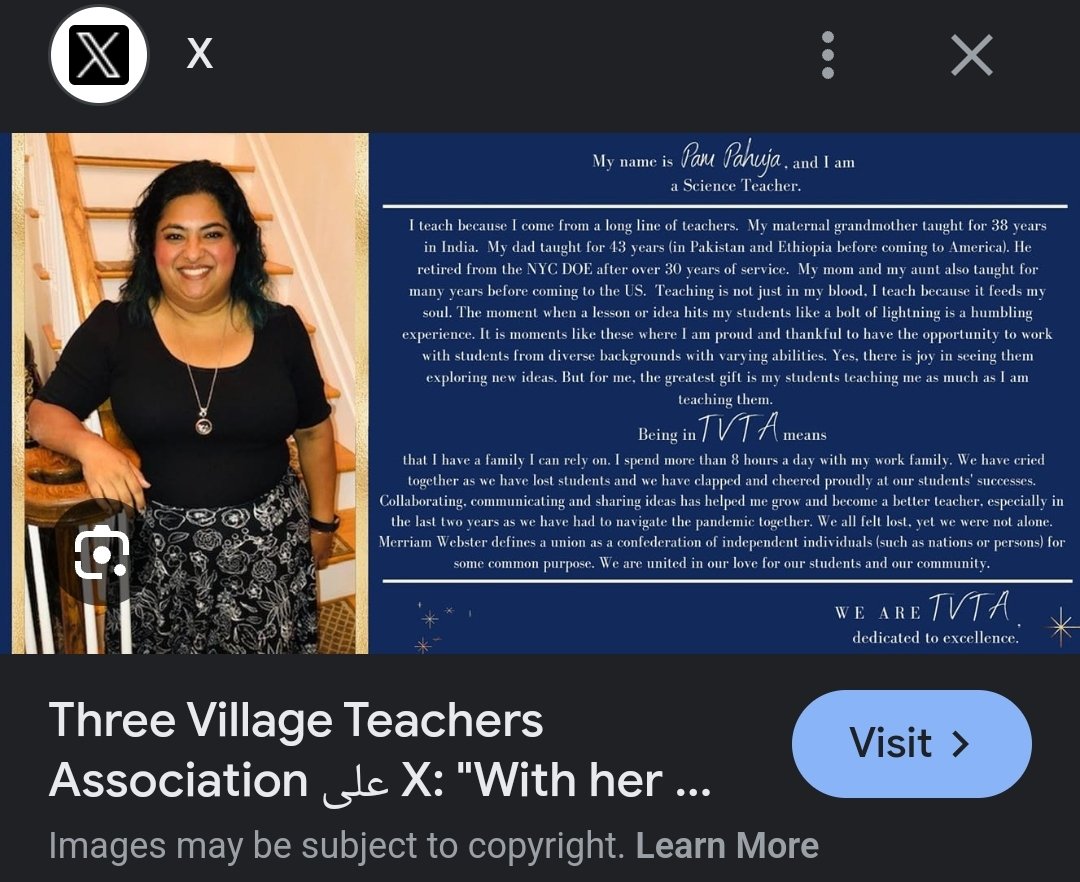 The teachers union posted, "Pamila Pahuja is a true gem to the Three Village CommUNITY!" Image