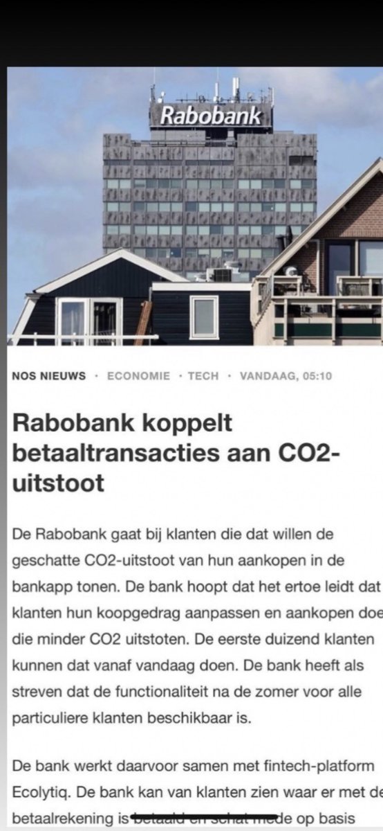 As of today Dutch clients of @Rabobank can opt in to view the CO2 footprint of their purchases in their bank app.