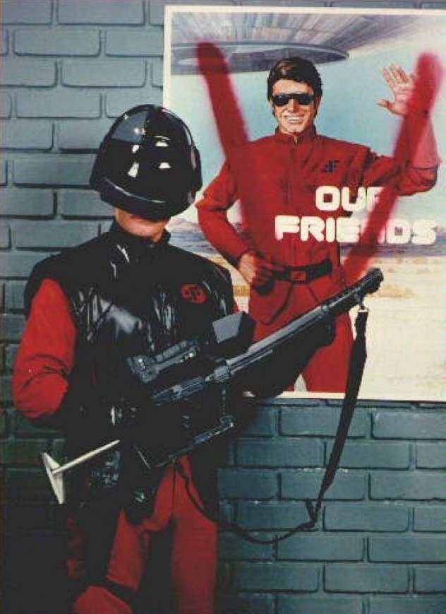 V: The Final Battle junked the political themes of the original mini-series in favour of more straightforward science fantasy. The Resistance would battle the Visitors at various locations, unmasking them as alien lizards on live TV.