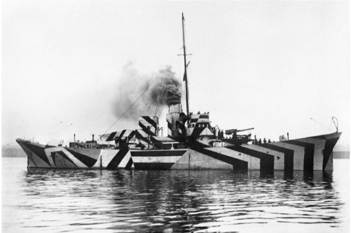 Traditional pattern camoflague had been used by the British Royal Navy to break up a ship's outline for some time. But in 1917 artist Norman Wilkinson presented the Admiralty with a different idea - camoflague that confused enemy rangefinders.