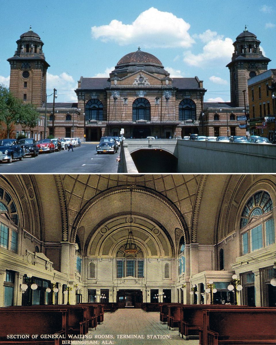 Another great train station demolished in the '60s — this time for a new highway. As the motorcar flourished and railways fell into disuse, Alabama's Byzantine / Beaux-Arts wonder was pulled down.