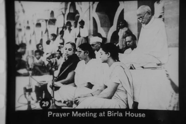 He began his walk to prayer location by walking with Manuben to his right and Abha to his left, holding onto them as walking sticks