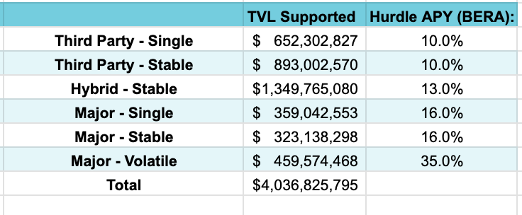 4/ Then, using the stated hurdle rates from before, you're able to get an understanding of how much TVL can be supported at those hurdle rates in just BERA terms, based on the FDV that you decided on.