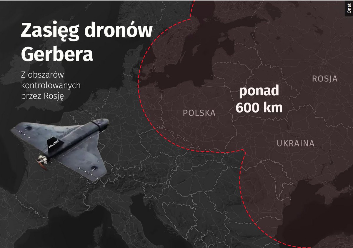 Wątpliwość 2: Dron Gerbera ma zasięg do 600 kilometrów to jak niby dotarły do nas a u nas a z tak daleko? Onet pokusił się o analizę zasięgów i naniósł info na mapy - oto one jako pierwszy Shaheed 136 - alias Gerań i to chyba nie ma żadnych wątpliwości co do możliwości tego drona - a nawet uznajmy ze producent wskazuje zasięg do 2,5 tys km. Niech im będzie... 2/n (foto Onet)