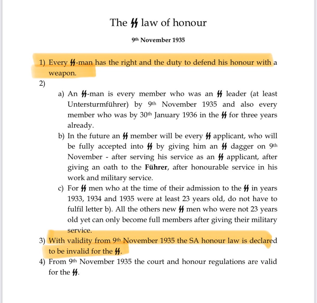 Honor is very important in National Socialism and likewise was within the SS. All men retained the right to “defend their honour with a weapon”.