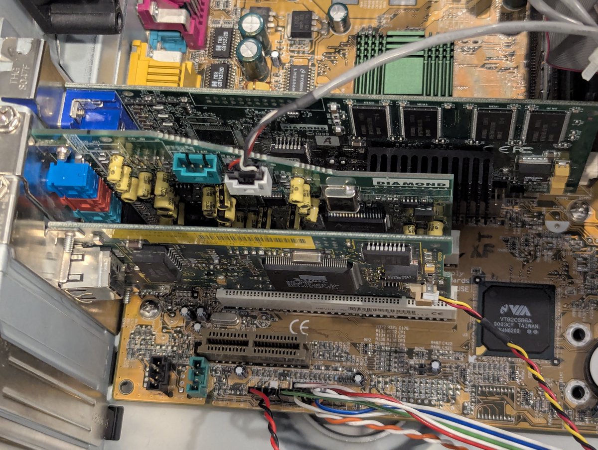 So, as you saw from my first photo, there are two PCI slots. I have a 3Com network card and a Aureal Vortex AU8820 sound card for Windows 3.11 sound compatibility. But when I move either card into the second slot, more than not, it ceases to work.