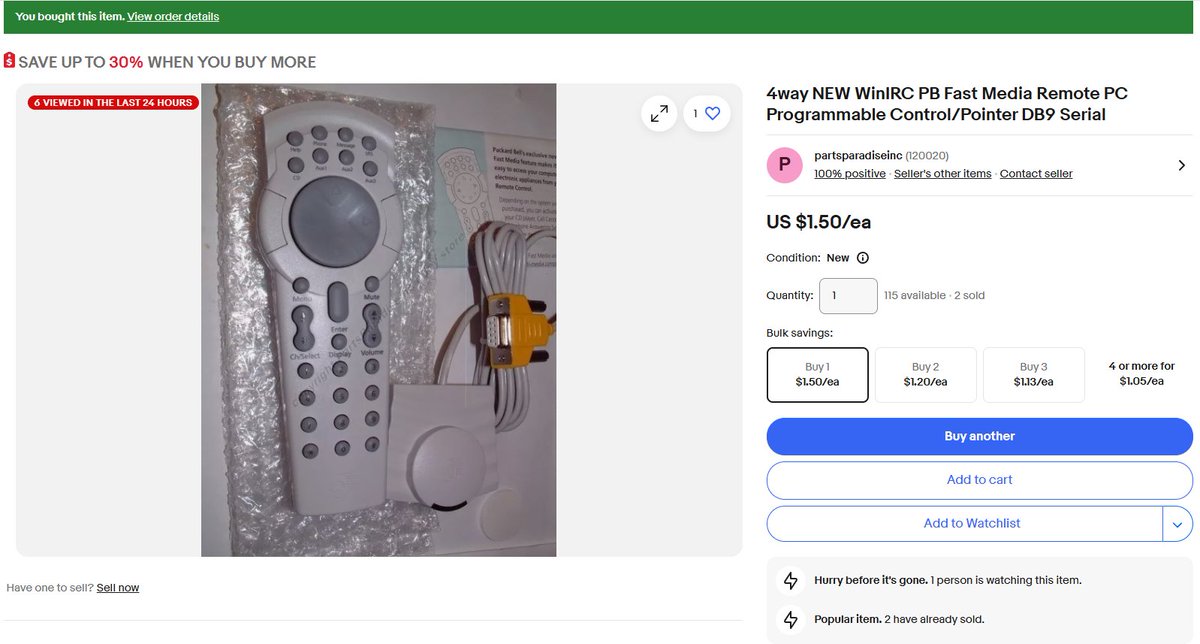 My latest purchase cost me a whopping $1.50 plus shipping. It's a Fast Media Remote Control for my new Packard Bell, and it's kindof neat! Let's talk about it in a 🧵 here!