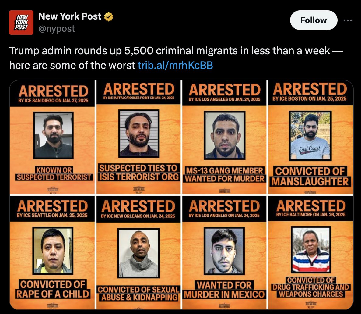 3) TRANSPARENCY. The video and images are being blasted everywhere across all media platforms. The TV hits are relentless, every day. ICE posts its arrest numbers to 𝕏 daily. ICE has nothing to hide.