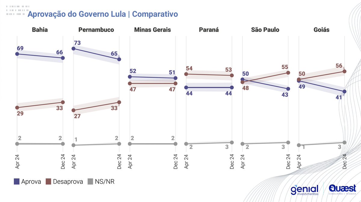 1/ Genial/Quaest de dez/24 mostra que ao final do segundo ano de governo, Lula é aprovado por 52% e reprovado por 47%, resultado estável em relação à pesquisa anterior.
