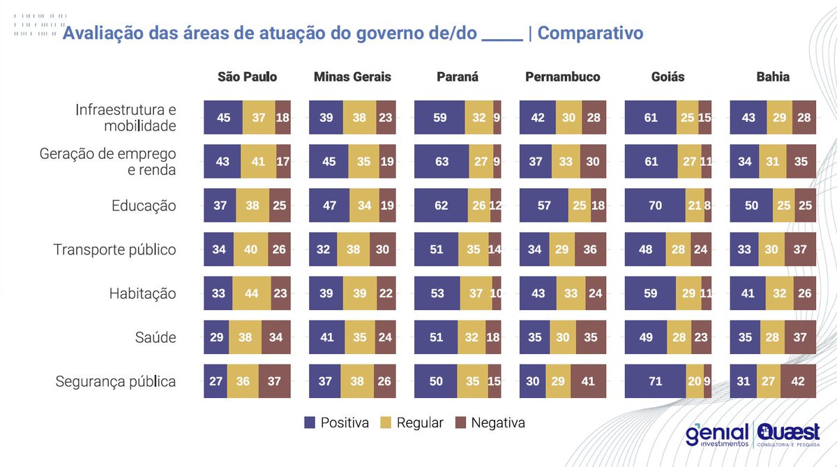 3/ A amostra desta pesquisa nos permite estudar os resultados dentro de 6 estados. BA (66%) e PE (65%) são os estados com as maiores taxas de aprovação do governo. GO (41%), SP (43%) e PR (44%) têm as menores taxas de aprovação. MG reproduz a média nacional.