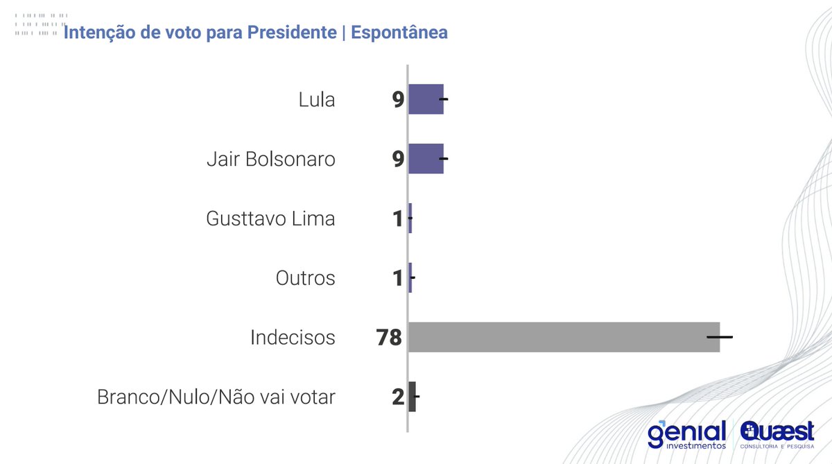 8/ Apesar de todas essas simulações, que mais lembram as análises a partir da teoria de Arrow, a eleição de 2026 está longe de estar definida de alguma forma: 78% dos eleitores não conseguem dizer espontaneamente em quem votariam se as eleições fossem hoje. Lula teria 9% e Bolsonaro outros 9%, em uma demonstração da fraqueza e da força dos dois ao mesmo tempo.