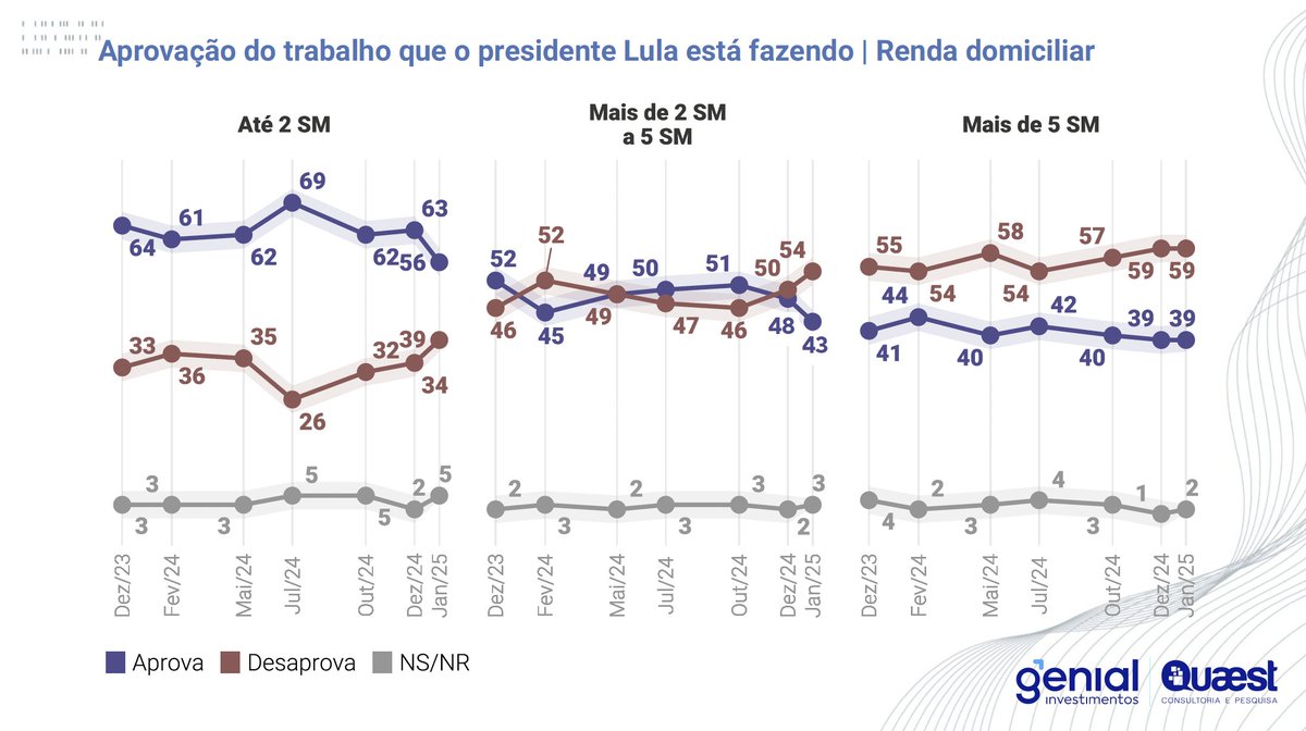 3/ A piora na aprovação também apareceu forte no eleitorado que tem renda baixa (-7pp) e renda média (-5pp). Os anúncios feitos pelo governo para atingir quem ganha até 5 salários não parecem surtir o efeito esperado.