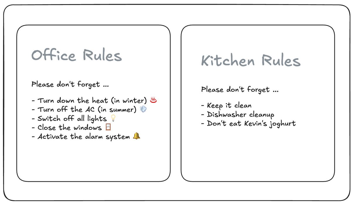 3/ Now, let’s go back to our real-world office example. What if we had rules for the kitchen too? In that case, we wouldn’t write them on the same note as the office rules. Instead, we’d put them on a separate piece of paper and stick it to the kitchen door.