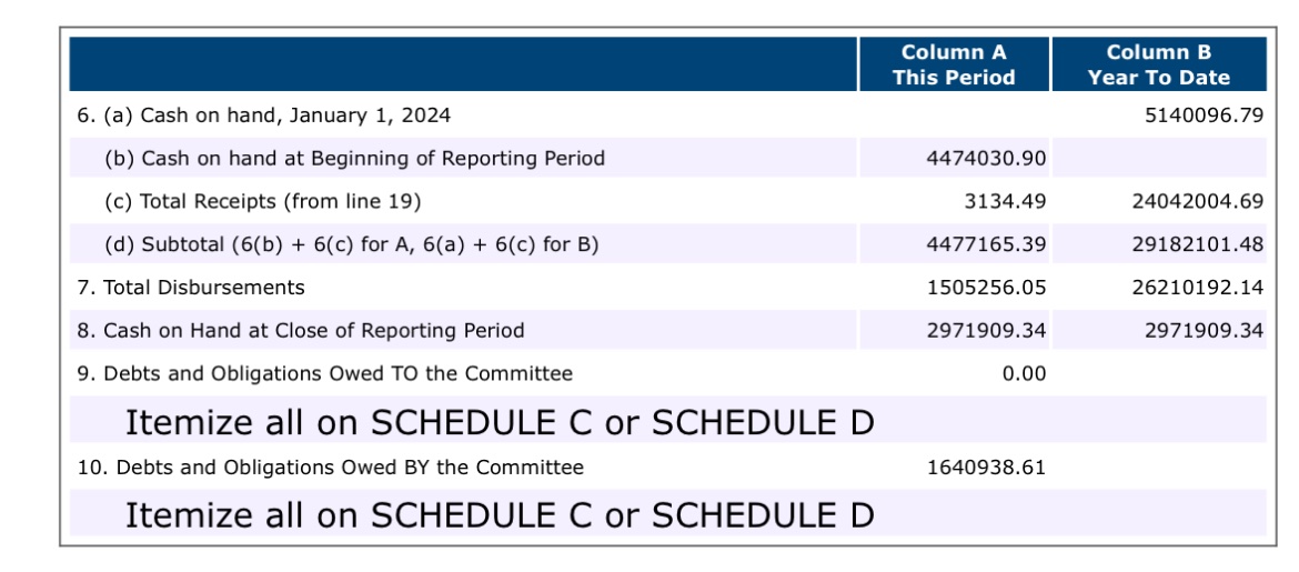 Odd new filing for June fundraising shows Trump’s “Save America” PAC—his longtime legal slush fund—had just $3M on hand, owed $1.6M in debt, and reported just $3,100 in receipts... docquery.fec.gov/cgi-bin/forms/…