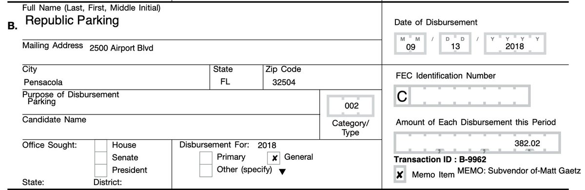 I've been obsessed with a Gaetz campaign parking payment for years—$382 from his personal funds to a Pensacola airport parking garage, which the campaign reimbursed. In four years of records, the campaign had never paid for parking anywhere else, ever. We might have an answer now