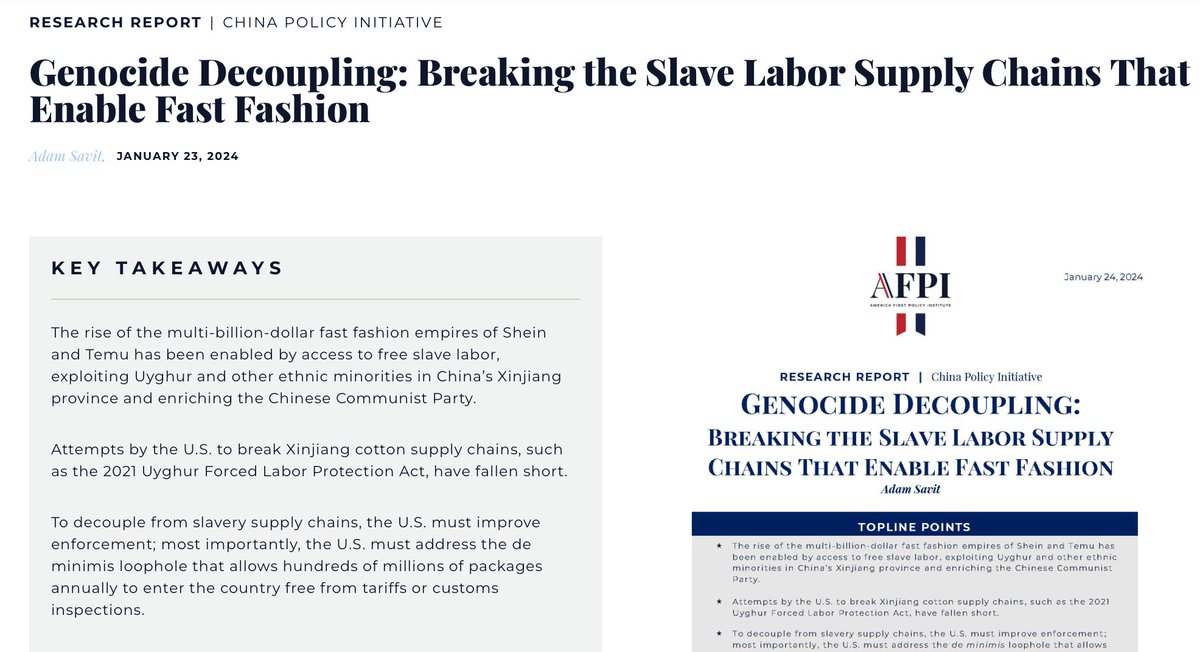 Last January, pro-Trump group America First Policy Institute released a report titled “Genocide Decoupling,” accusing Shein of using “free slave labor, exploiting Uyghur and other ethnic minorities.” americafirstpolicy.com/issues/genocid…