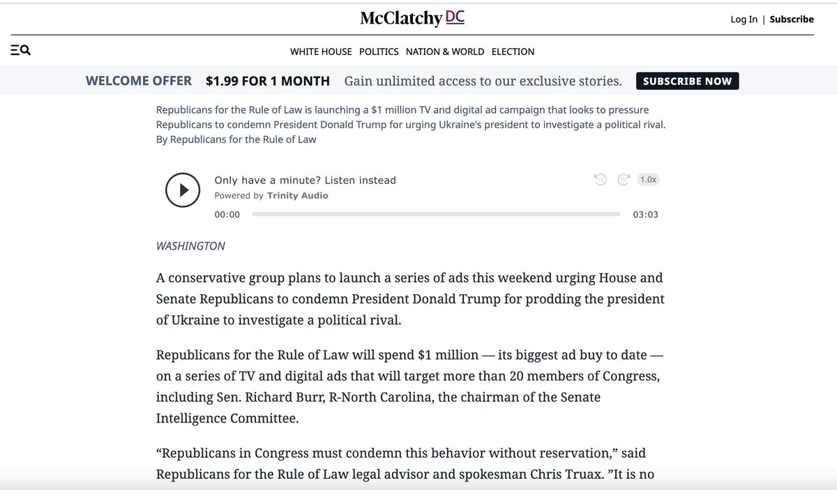 Kristol and a group of Never Trump allies founded Defending Democracy Together in 2019 for the express purpose of opposing Donald Trump. One of its first initiatives was "Republicans for the Rule of Law." DDT spent a million dollars in campaign ads to pressure Republican lawmakers to condemn Donald Trump's famous "perfect" phone call with Zelensky, which led to his impeachment.