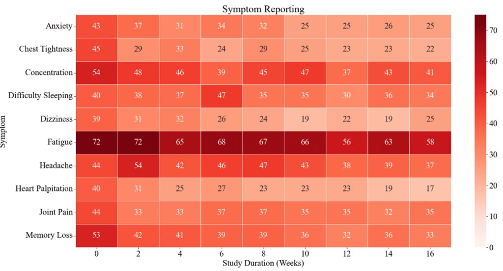 2) Researchers wanted to learn more about how long COVID symptoms change over time. They studied 75 people with long COVID for 16 weeks. The participants came to the clinic 5 times and had phone check-ins in between.