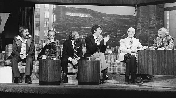 Bandleader Doc Severinsen, Bing Crosby, Ray Bolger, Marvin Hamlisch, Burt Mustin, and Johnny Carson on March 5, 1976.