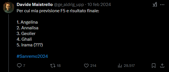 Al quarto posto si è piazzato Ghali, che anche grazie al secondo ottenuto giovedì si propone come un serissimo candidato per la top5. Con ogni probabilità è già 4° assoluto, ed è difficile pensare che venga buttato giù stasera. Chapeau a lui, a Rich e al suo team 👏 #Sanremo2024