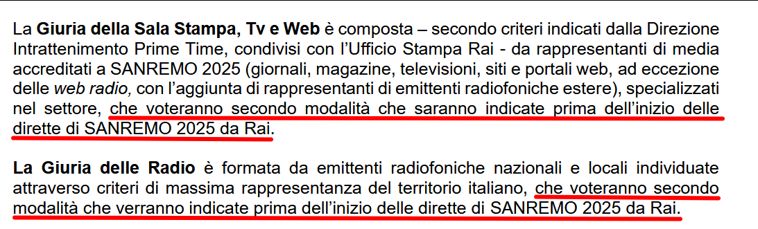 ... una "Giuria delle Radio" che fino al 2023 era accorpata alla Sala Stampa, TV e Web e sarà composta da (un numero indefinito di membri di?) "emittenti radiofoniche, nazionali e locali, individuate secondo criteri di rappresentanza dell’intero territorio italiano"