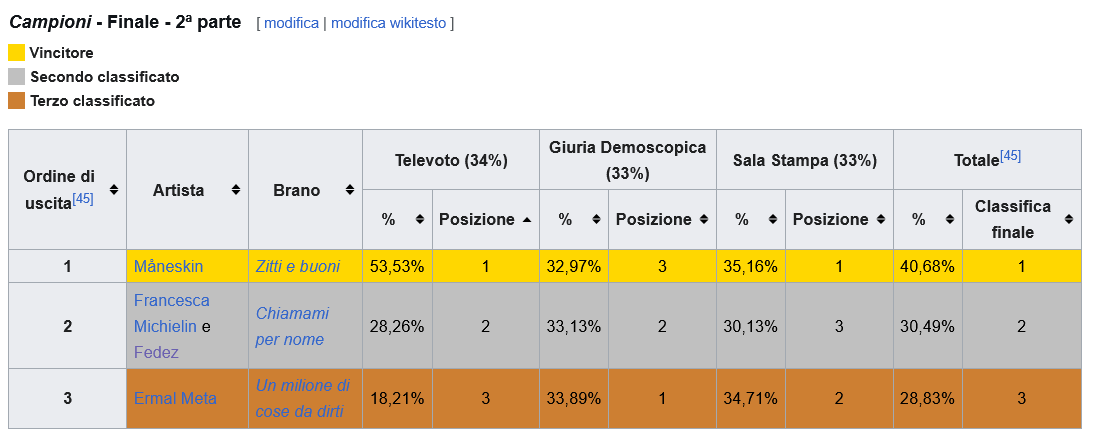 Per il fenomeno di schiacciamento che abbiamo spiegato, si ebbe una situazione di sostanziale pareggio sciolto dal 54% del televoto in favore dei Måneskin.