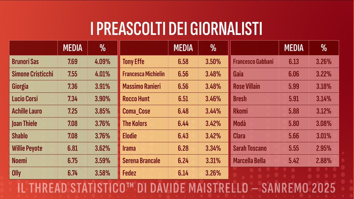 Se prendessimo la classifica dei preascolti dei giornalisti come campione rappresentativo di come voterà la Sala Stampa, i voti numerici si convertirebbero così.