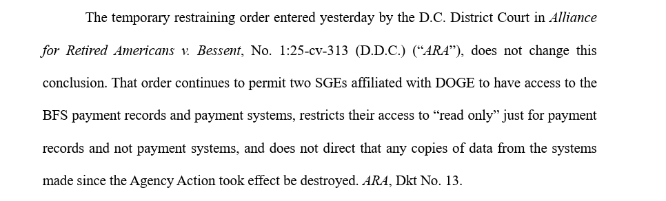 So after 1 fed. judge held unions lacked standing to challenge access to Treasury Dep't another found States had standing & entered TRO barring access. Hope @doge just works around by having team just tell Trump Treasury Dep't folks step-by-step what to do w/ data. 1/