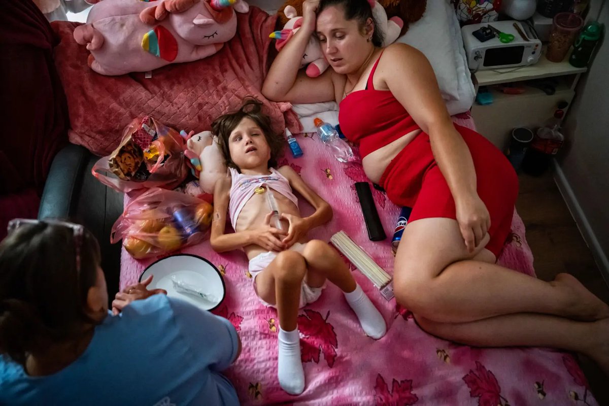 3/6 Sonya Kryvolapchuk, 5, lies semi-conscious next to her mother, Natalia, 27, as she administers paracetamol with a syringe through a port as cancer has metastasized throughout her body. Sonya passed away in August 2024.