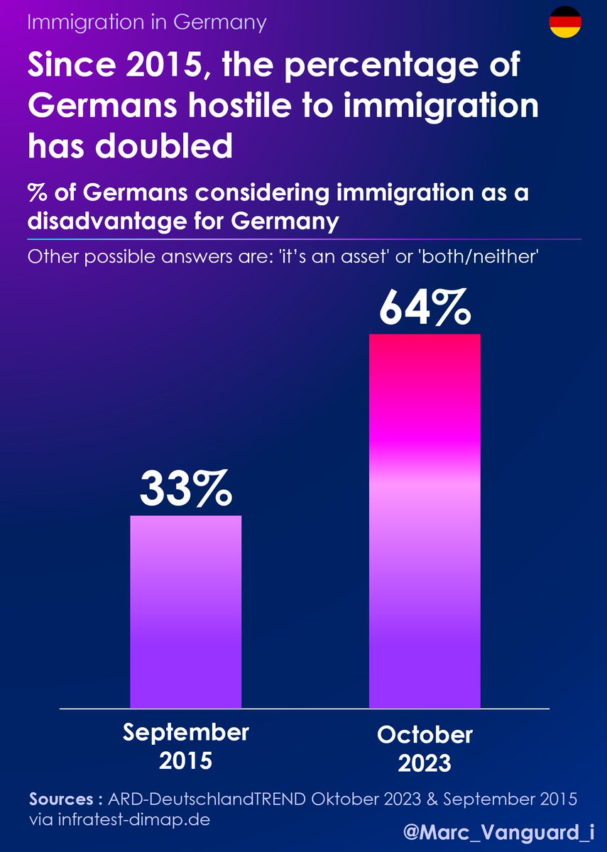 ๐ 64% see immigration as a disadvantage for Germany, compared to only 33% in 2015, marking a historic shift. โฌ๏ธ