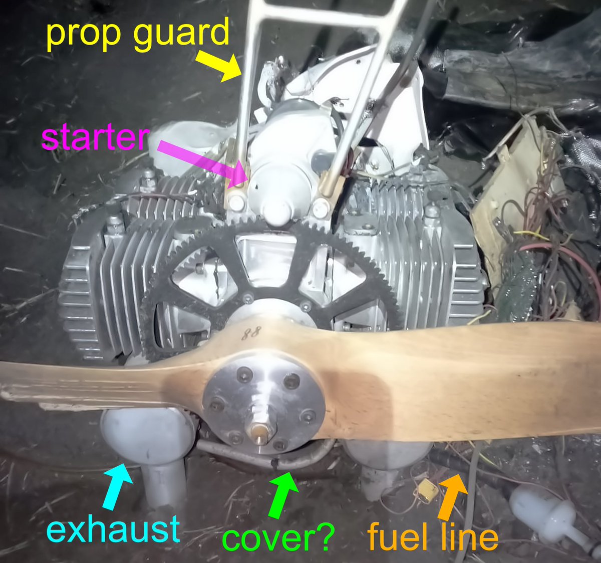 3. In July 2024, one of these drones crashed in russia resulting in a couple of photos. This is the underside of the engine as the drone's exhaust points upwards. The engine has a bracket added that is likely a prop guard. Note the electric start on this single-use engine.