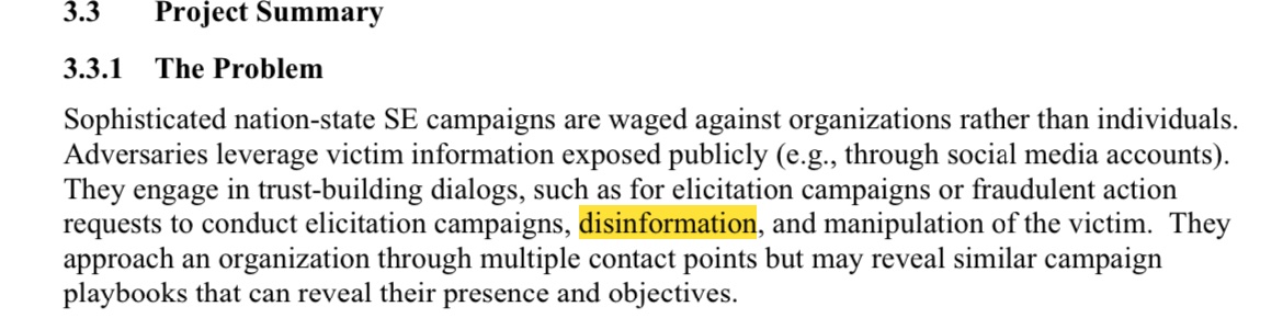Codenamed Project NEMESIS, an explicit goal of the research of one of the contractors was to develop tools to “demonstrate human plausibility” in interactions with targets for the purpose of combatting “disinformation.”