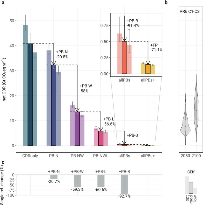 4/ When these boundaries are not considered, BECCS could theoretically remove billions of tons of CO₂/yr. But respecting them reduces BECCS potential to <200 MtCO₂/yr by 2050 (outside current farmland). This is far below the ~7.5 GtCO₂/yr assumed in many climate scenarios.