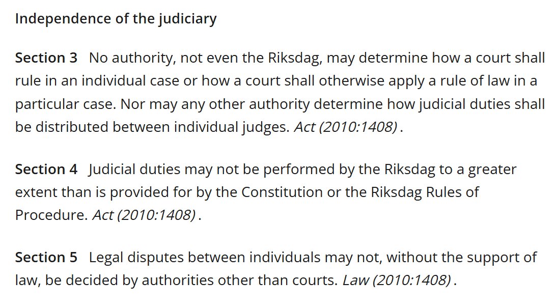 Swedish courts independent of the government under Chapter 11, Section 3 of their 1974 Constitution.