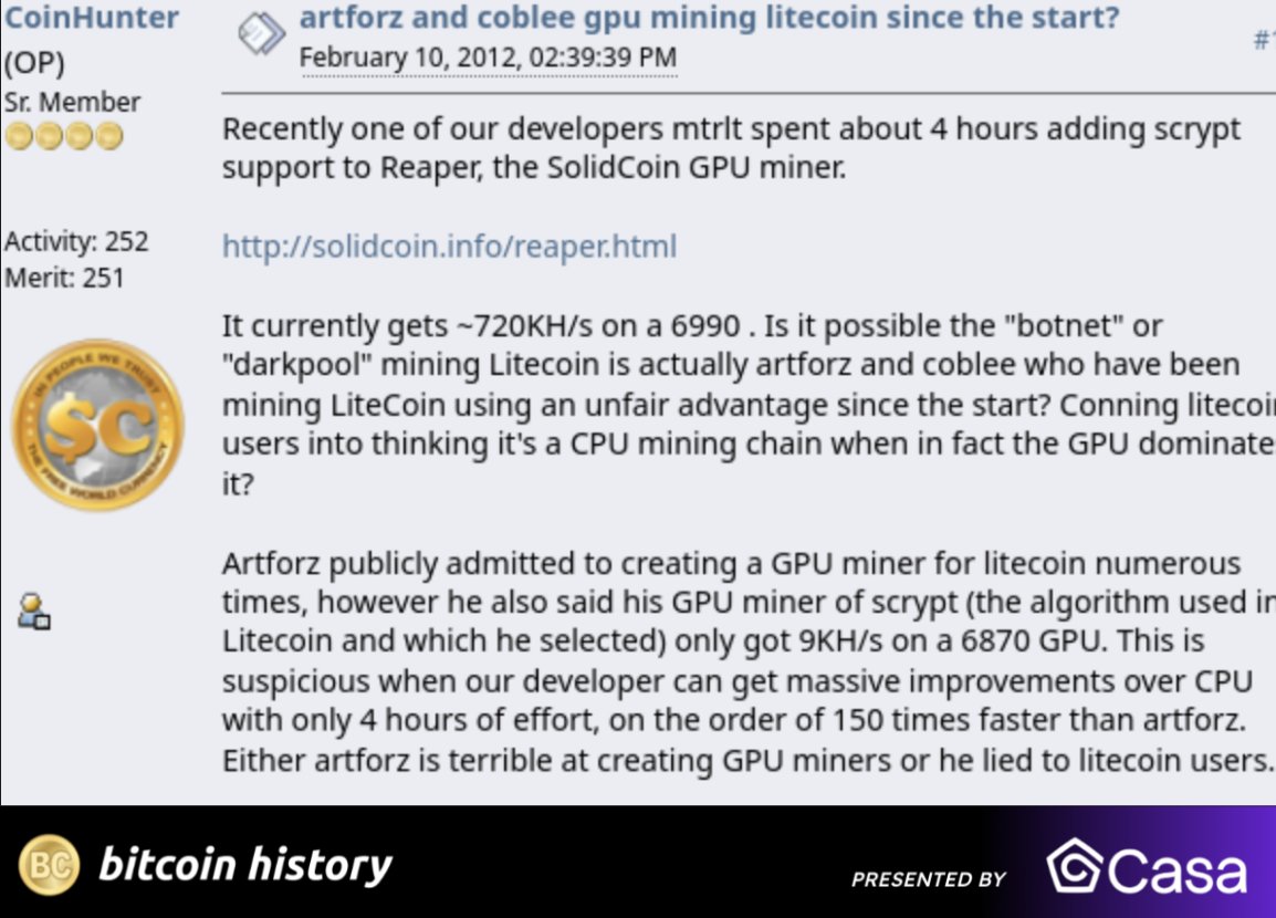 ArtForz countered the accusations — he admitted GPU mining of Scrypt was always possible