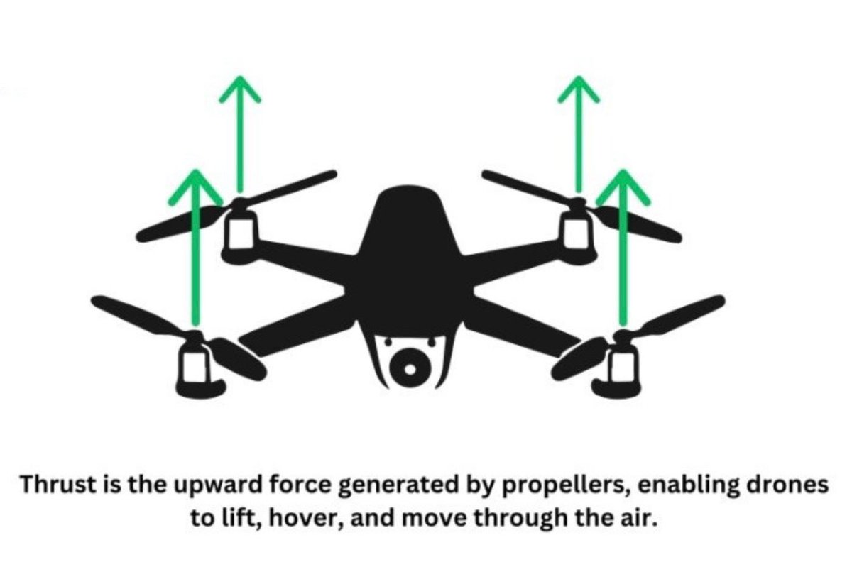 Thrust is the force generated by the propeller that propels the drone upwards and forward. 1/