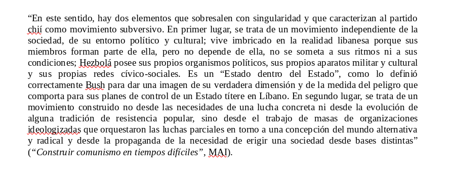 (+) por el otro, complicidad con las estructuras del imperialismo y temor a desatar un mar de masas. En Hezbolá esto se expresa, entre otras cosas, en forma de lucha e integración en el Estado títere libanés.