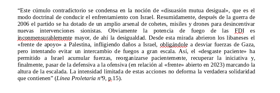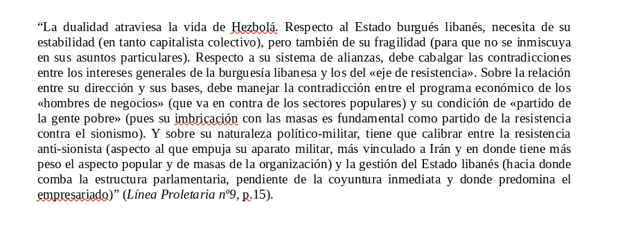 Esto no significa negar el el carácter antiimperialista de Hezbolá; su lucha debilita objetivamente al imperialismo, obstruye sus planes. Esto le distingue del resistencialismo clásico (sindical, feminista…), que apuntala a la sociedad burguesa en su conjunto.