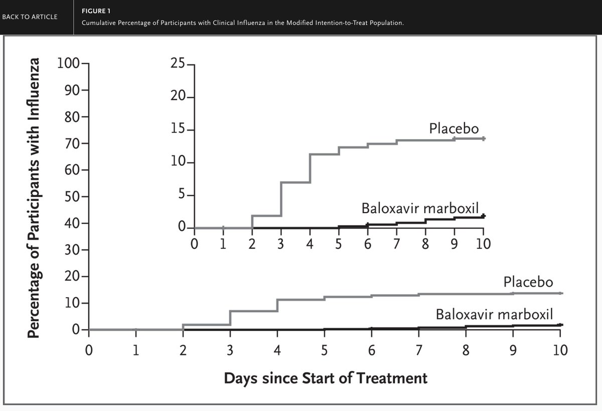 2) "Baloxavir was associated with significantly more rapid declines in infectious viral load than placebo or oseltamivir (Figure 3A and 3B)." nejm.org/doi/full/10.10…