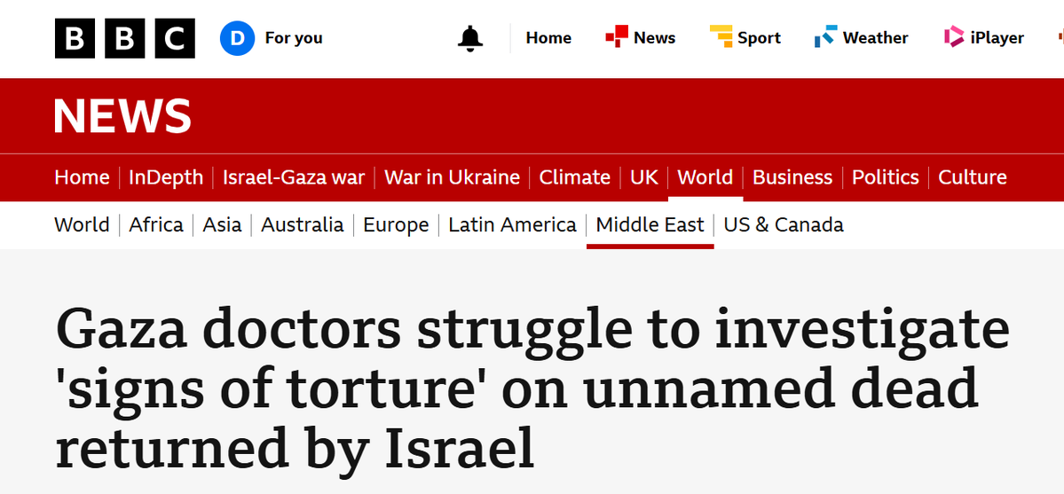 Hamas are constantly pushing narratives to demonise Israel. The latest one is about organ theft and torture of bodies of dead terrorists. Today's BBC headlines carry a big story on it... Because Hamas speaks and the BBC jumps...