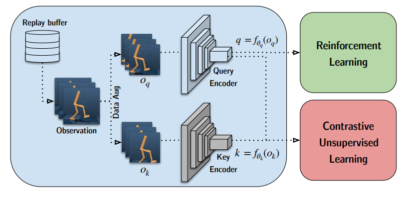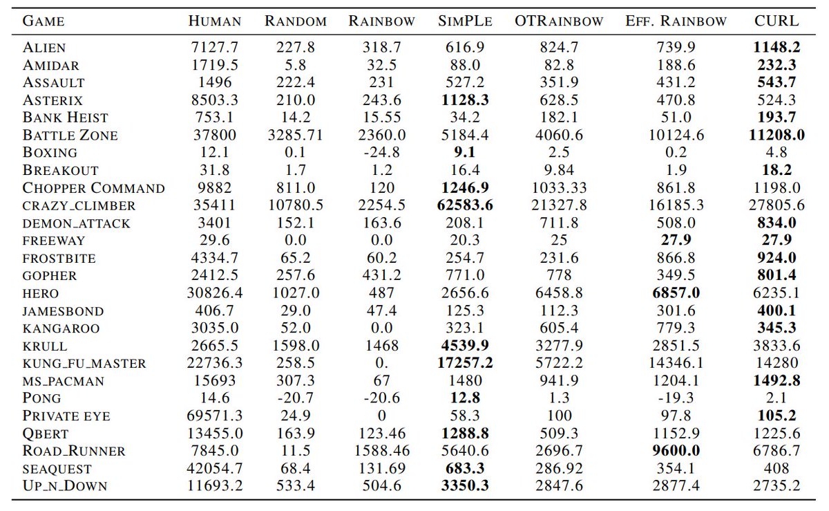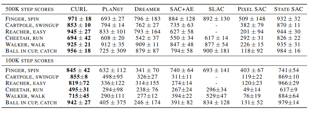 New paper - CURL: Contrastive Unsupervised Representations for RL! We use the simplest form of contrastive learning (instance-based) as an auxiliary task in model-free RL. SoTA by *significant* margin on DMControl and Atari for data-efficiency. arxiv.org/abs/2004.04136